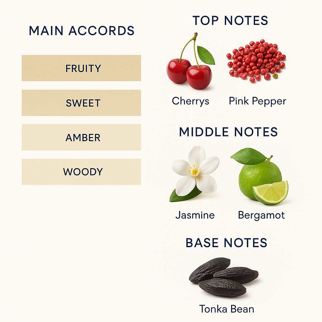 Delicious cherry granules spread around you in the first moments, accompanied by pink pepper and bergamot, to refresh your breath.