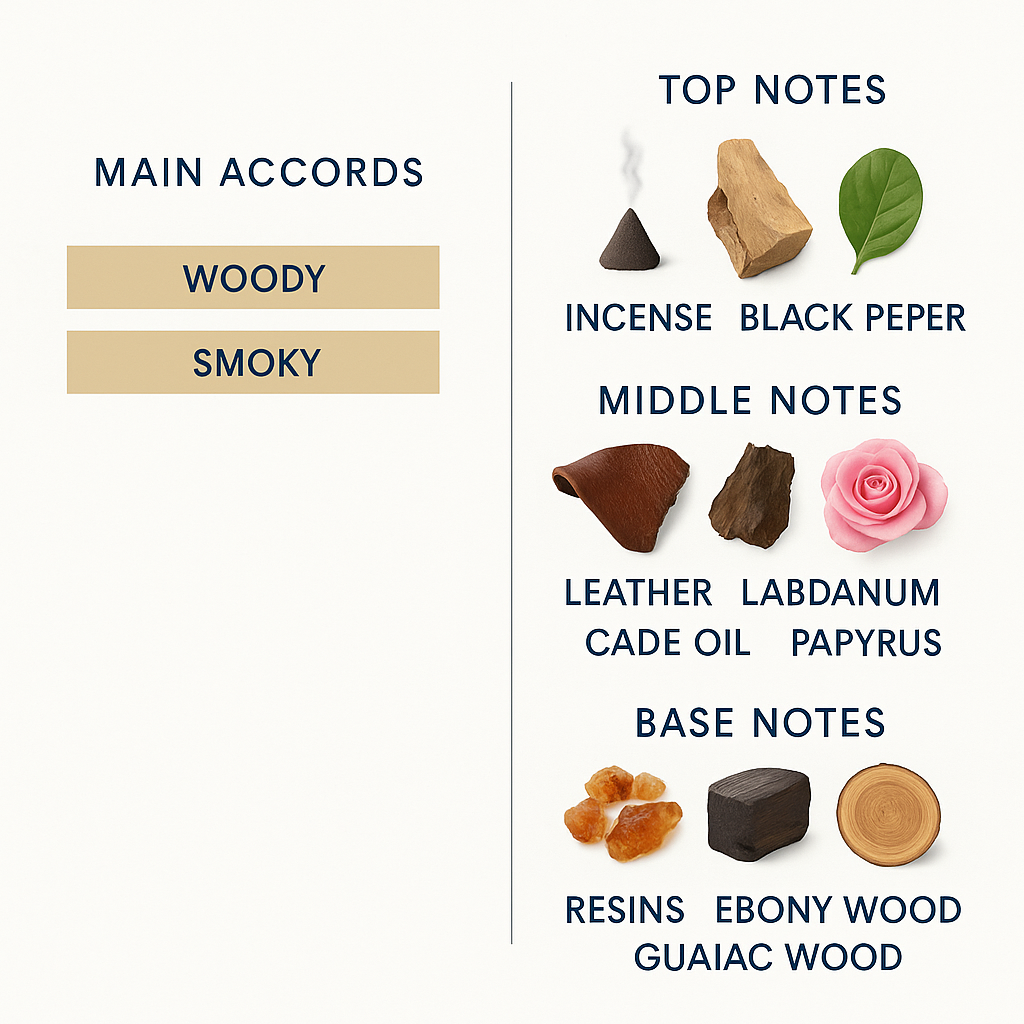 Heart notes: Leather, labdanum, cade oil, papyrus, rose