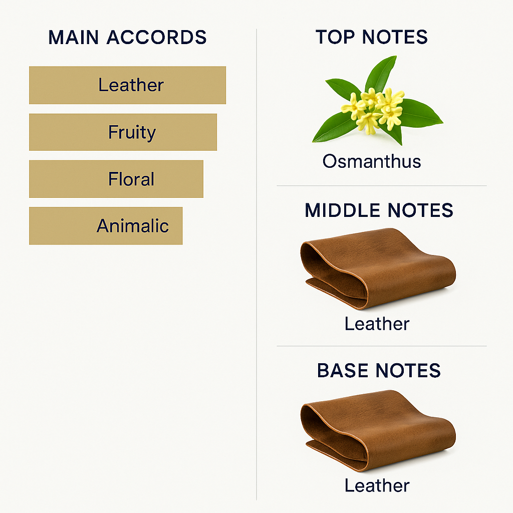 The fragrance opens with soft notes of osmanthus, a fruity, floral flower. The scent then evolves to reveal a rich leathery heart, giving the fragrance a masculine and bold character. The base rests on the same leather scent, ensuring a long-lasting fragrance.