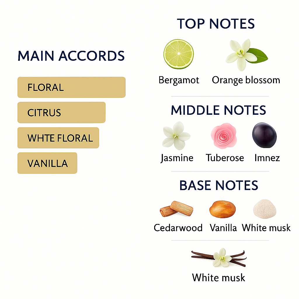 Orange blossom, Madagascar vanilla, bergamot, tuberose, cedarwood and white musk.