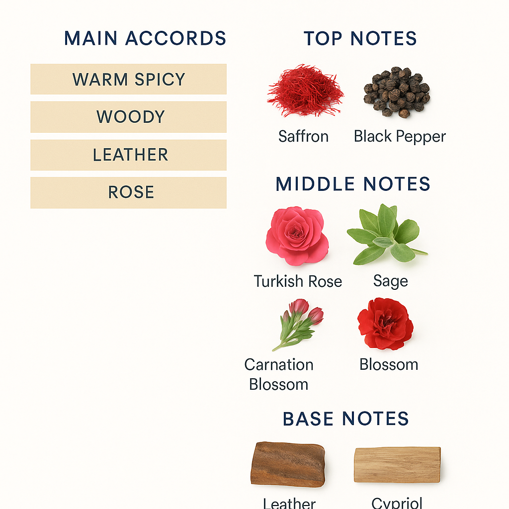 The fragrance opens with a warm, daring saffron note paired with fresh black pepper, adding richness and sharpness. The complex fougère heart reveals a delicate yet rich combination of Turkish rose, fresh sage, and spicy carnation blossom.