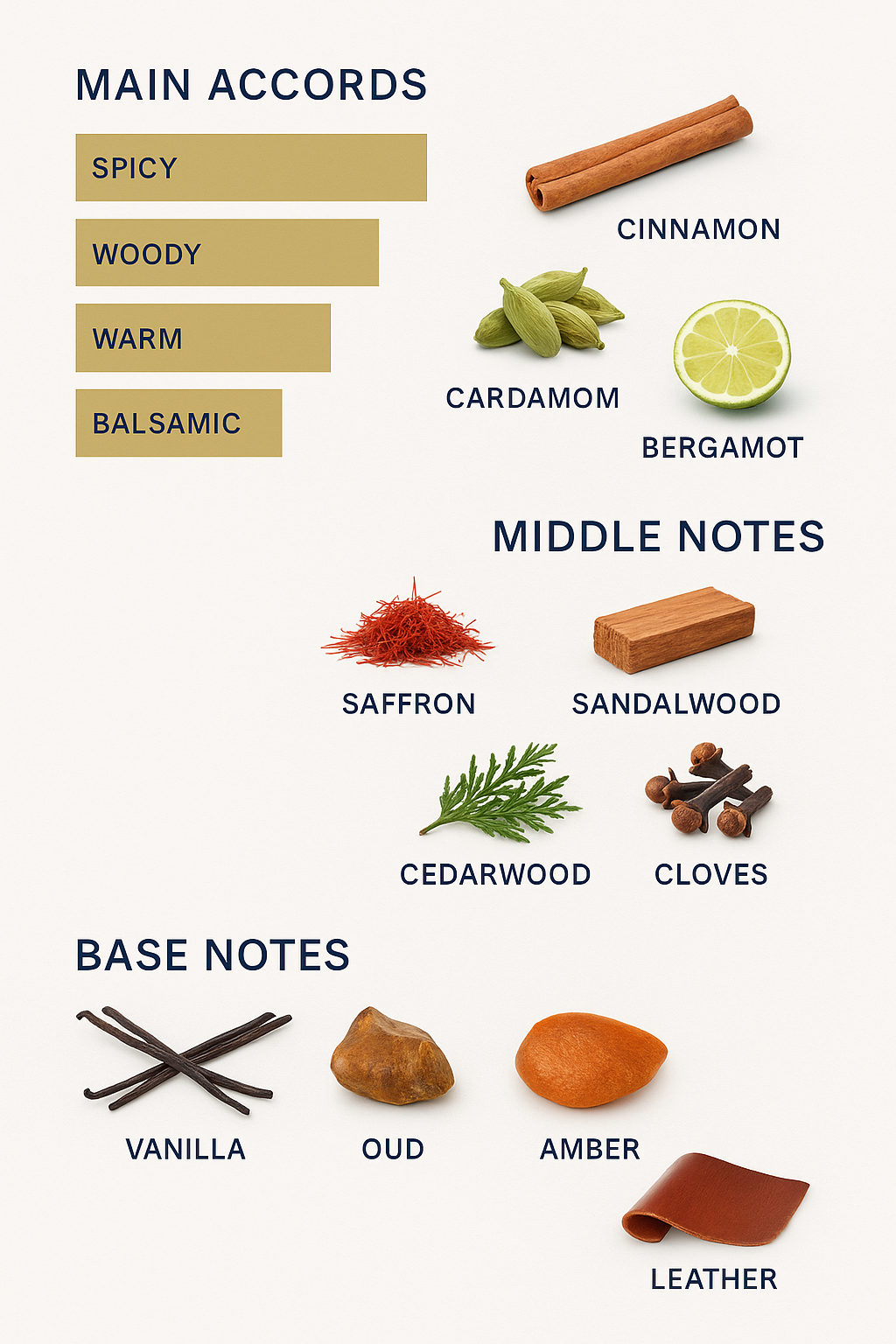 Heart notes: saffron, sandalwood, cedarwood, and cloves