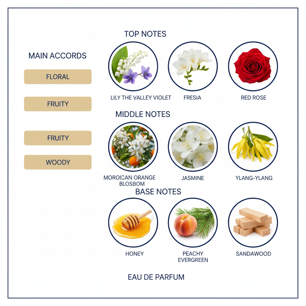 The top notes of this perfume feature a promising blend of lily of the valley and freesia with a subtle hint of violet. The heart of the fragrance intensifies with a bouquet of red roses, creating a captivating and harmonious floral mixture. This is followed by the inclusion of refreshing Moroccan orange blossom, warm and delicate jasmine, and sweet ylang-ylang.