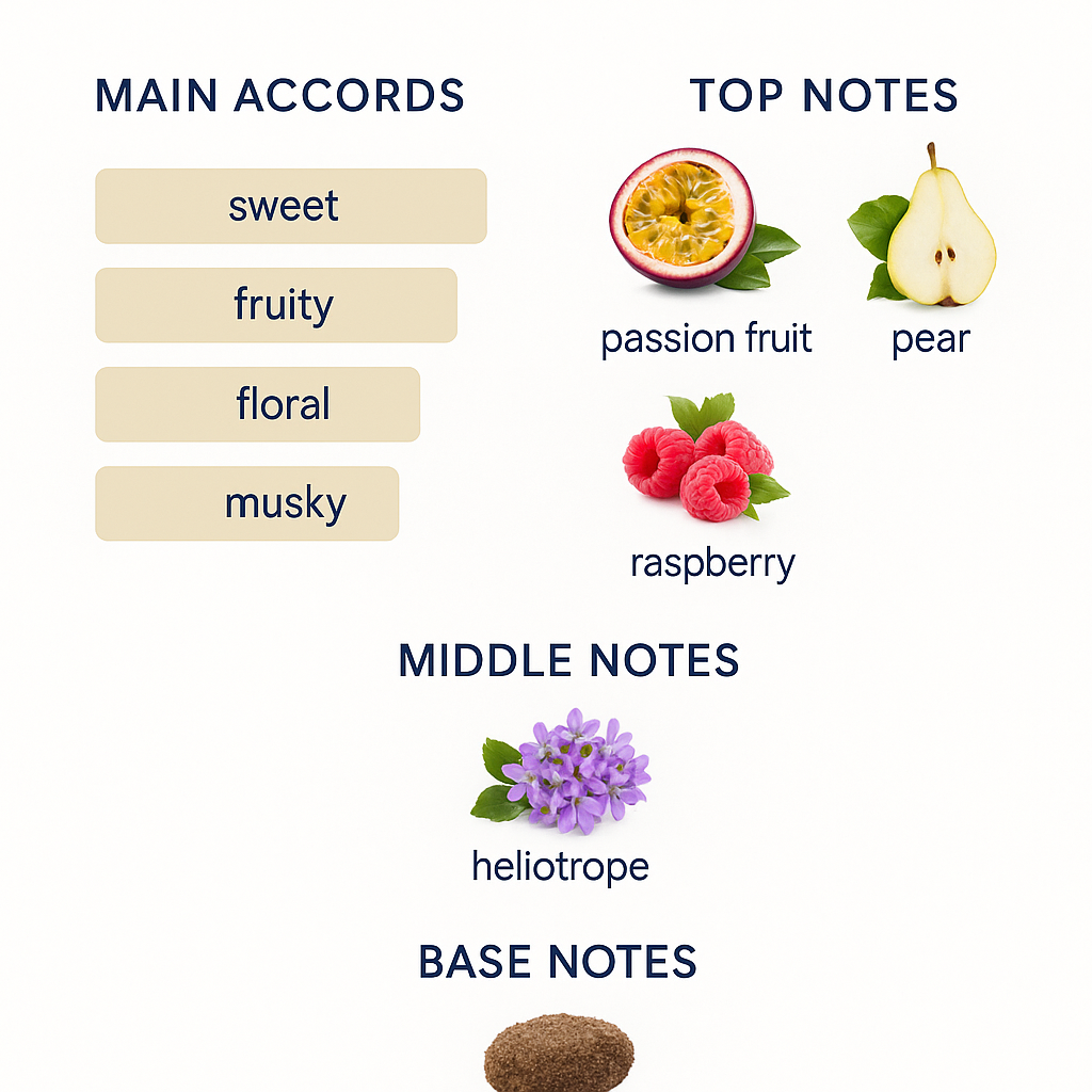 A luxury fragrance for men and women that delights everyone who wears it and takes them to another world. It gives you a feeling of greater confidence and happiness. The scent features a unique blend of sweet fruits like passion fruit, berries, and pear, combined with a warm touch of heliotrope flower and a sensual musk aroma.