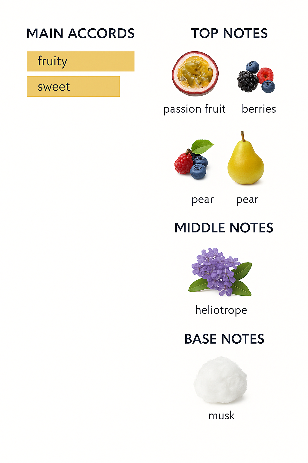 A luxurious fragrance for men and women, it delights everyone who wears it, taking them to another world, giving them a feeling of more confidence and happiness. It features a distinctive composition of sweet fruits of passion, berries, and pear, a warm scent of heliotrope flower, and a sensual scent of musk.