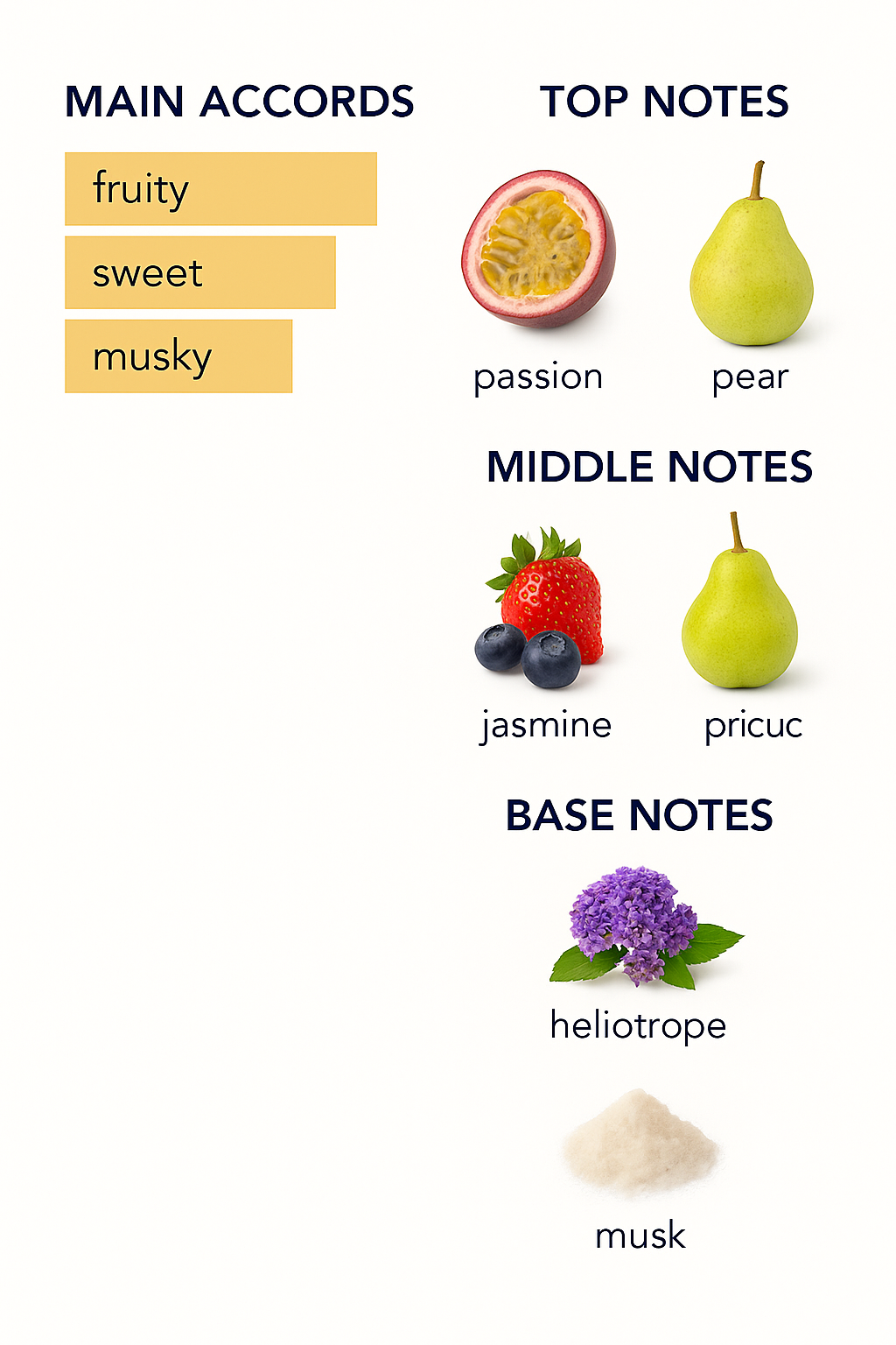A luxurious fragrance for men and women, it delights everyone who wears it, taking them to another world, giving them a feeling of more confidence and happiness. It features a distinctive composition of sweet fruits of passion, berries, and pear, a warm scent of heliotrope flower, and a sensual scent of musk.