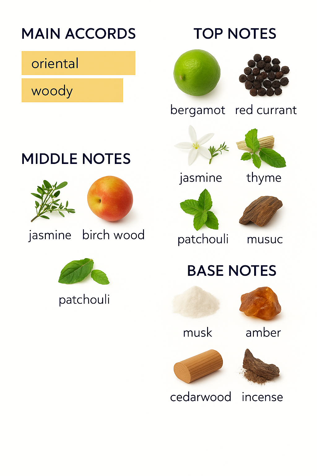 Heart notes: jasmine, thyme, birch wood, patchouli