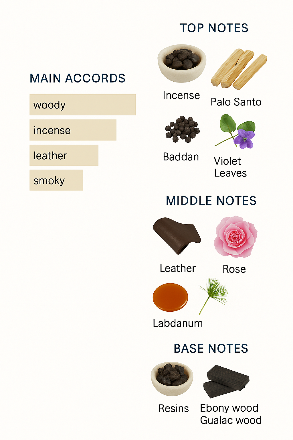 Heart notes: Leather, labdanum, cade oil, papyrus, and rose.