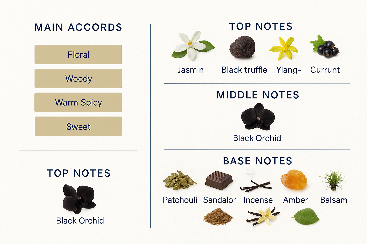 At first, this fragrance surrounds you with a fresh breeze full of jasmine, black truffle, ylang-ylang, blackcurrant, and citrus scents. Then, the scent of black orchid—the vibrant heart of the perfume—emerges. As it settles, you’ll notice lasting traces of patchouli, sandalwood, dark chocolate, incense, amber, vetiver, vanilla, and balsam staying with you.