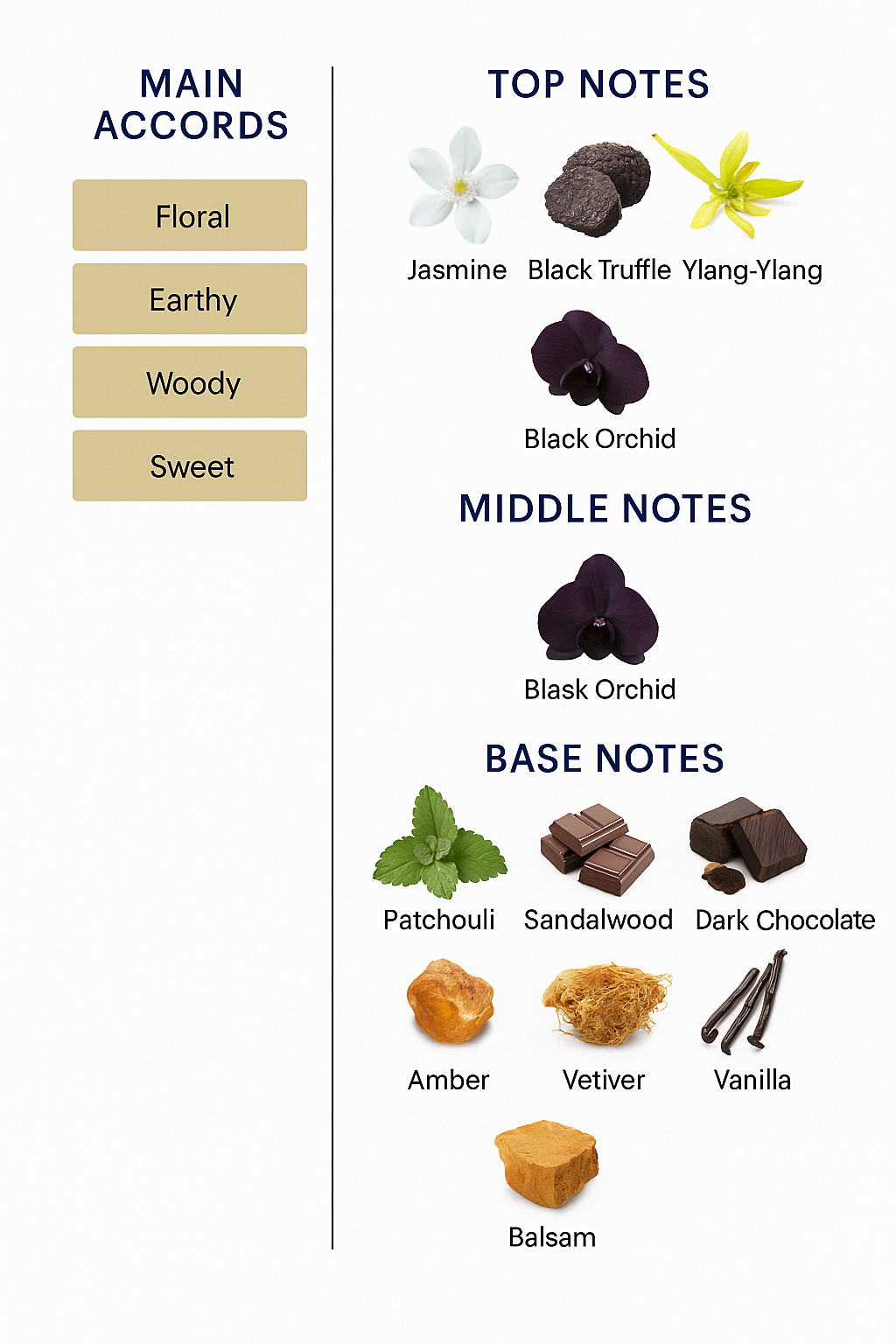 At first, this perfume surrounds you with a fresh breeze of jasmine, black truffle, ylang-ylang, blackcurrant, and citrus. Then, the scent of black orchid, the heart of the fragrance, appears. When it settles, you will notice the lasting notes of patchouli, sandalwood, dark chocolate, incense, amber, vetiver, vanilla, and balsam stay with you.