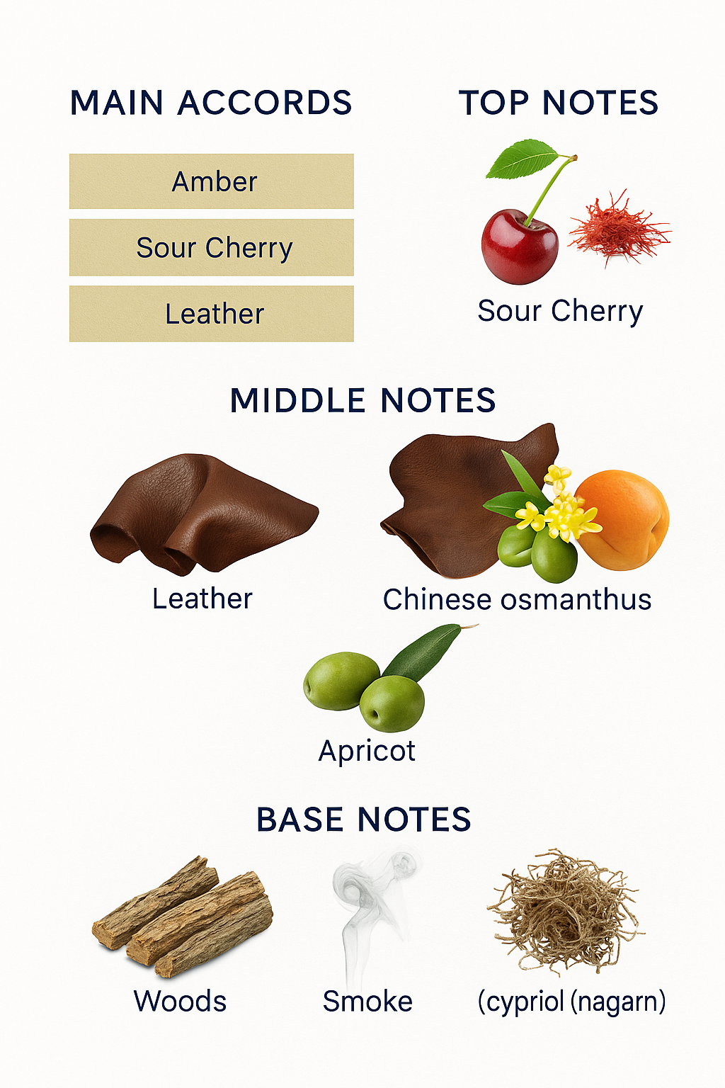 Heart notes: Leather, Chinese osmanthus, olive, and apricot