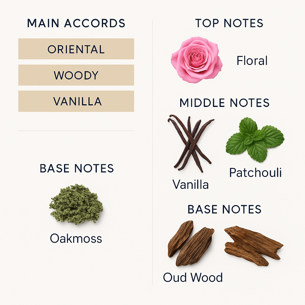 It combines rich feminine floral notes with earthy masculine hints, vanilla, patchouli, oud wood, and oakmoss.