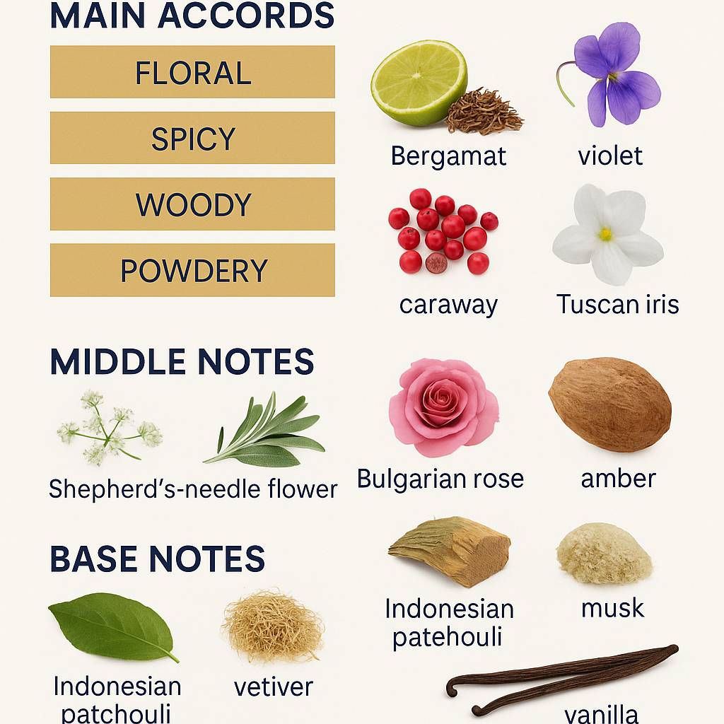 Top notes: Bergamot, caraway, pink pepper, violet, nutmeg, Tuscan iris