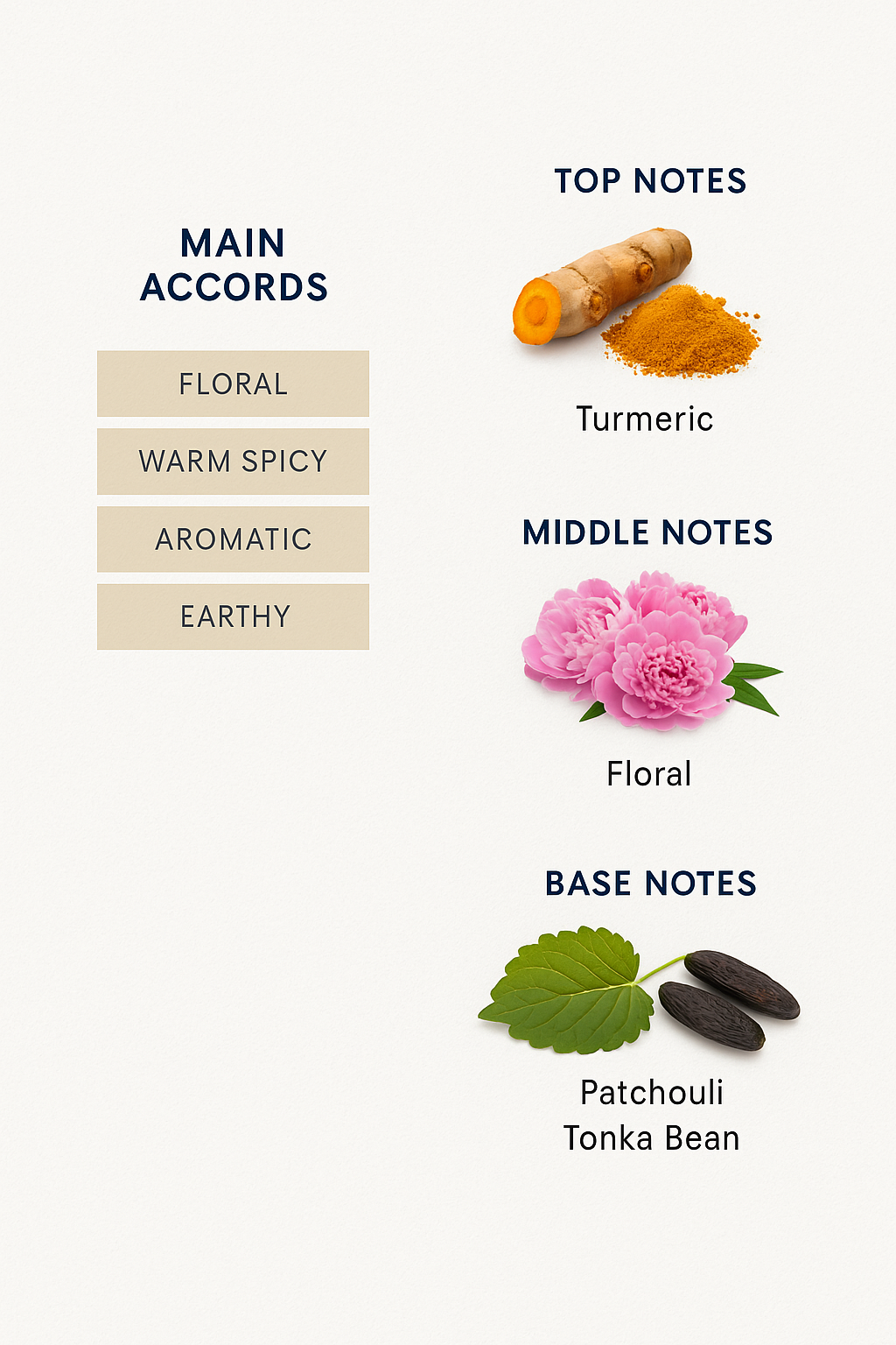A floral fragrance for men and women that gives you a warm scent, making you feel calm and peaceful. It also creates a magical and amazing atmosphere with a wonderful blend of turmeric, patchouli, and tonka beans.