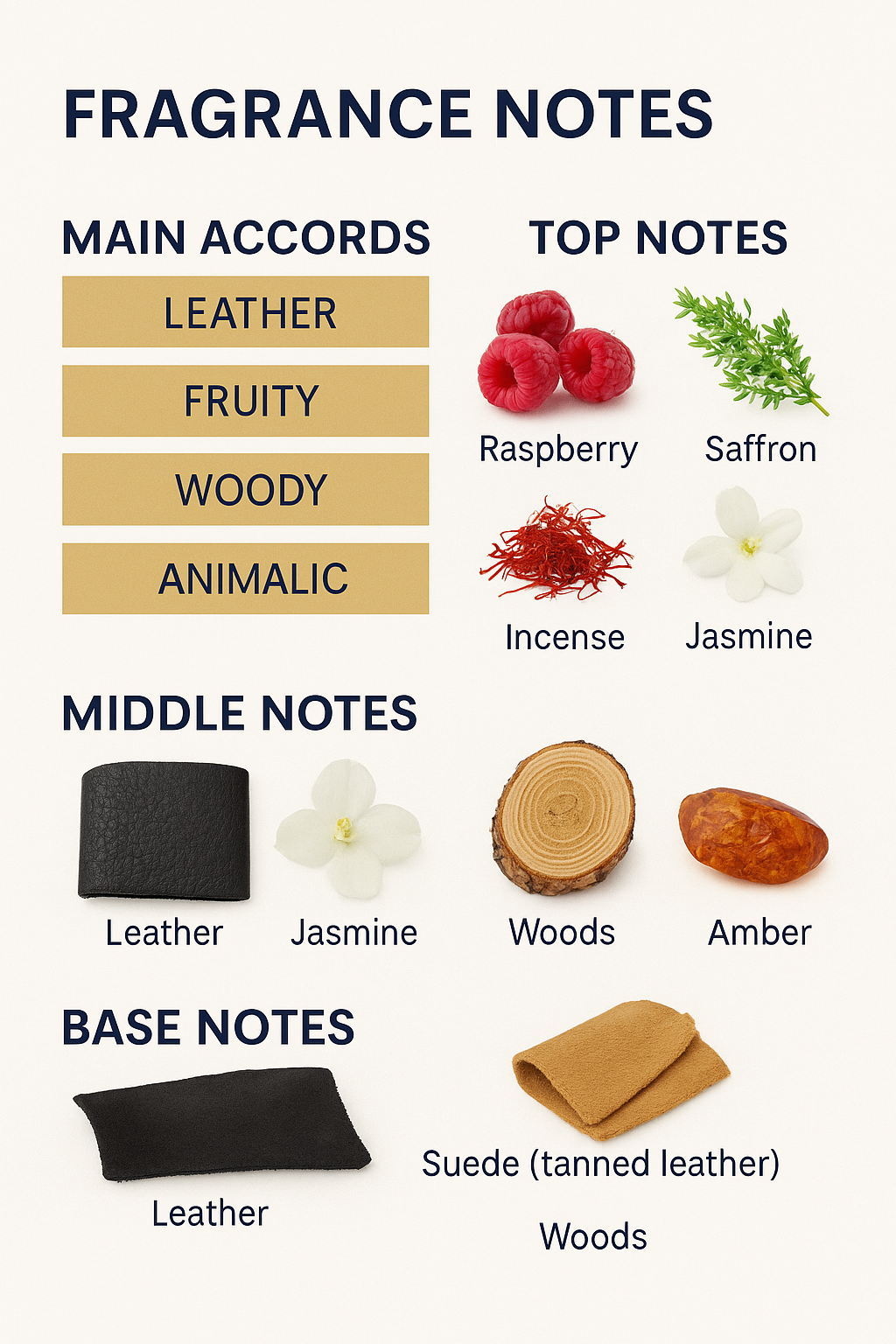 Base notes: Leather, suede (tanned leather), woods, and amber
