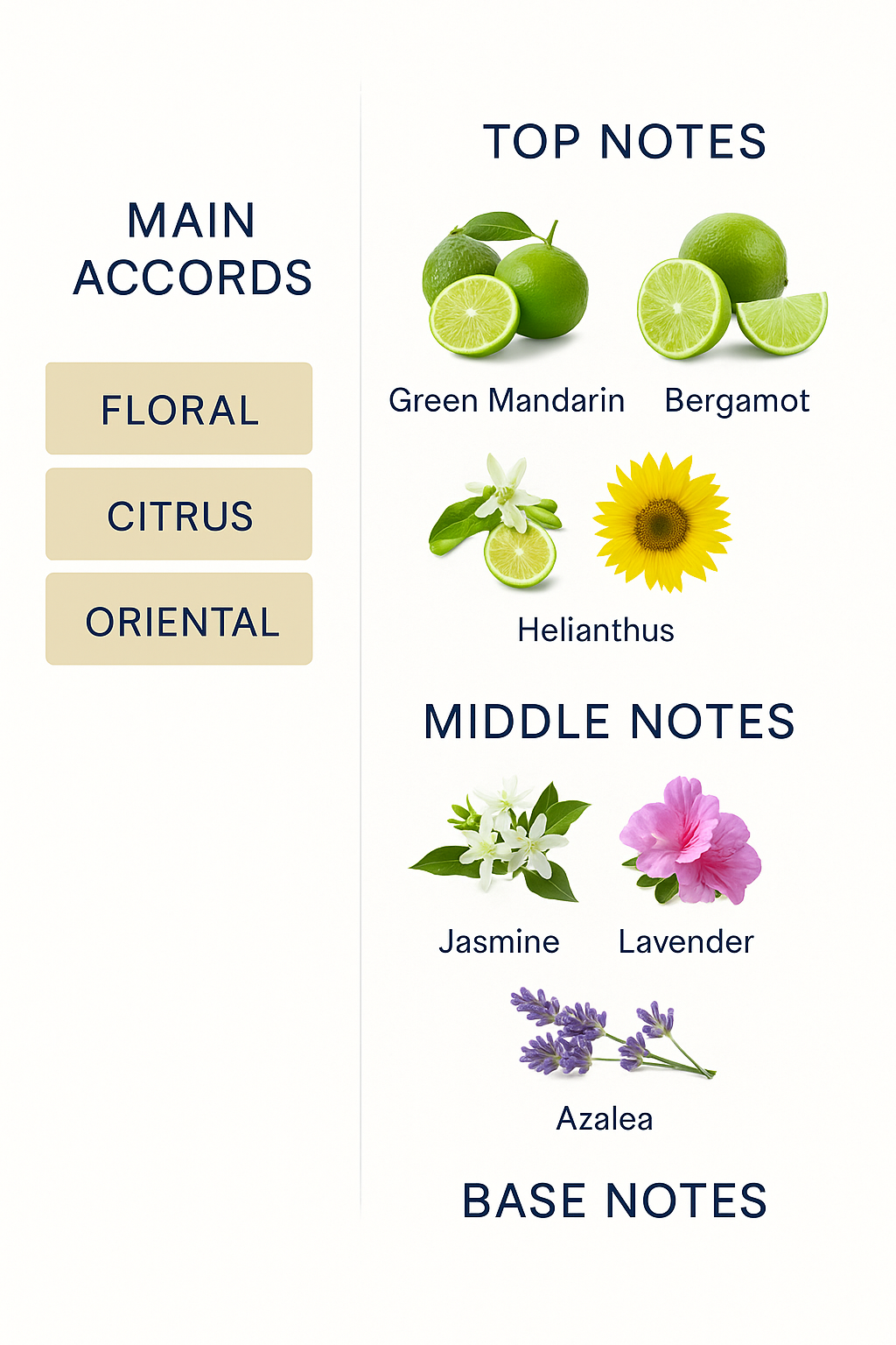 The scent starts with fresh and citrusy notes of green mandarin and bergamot, adding a lively and refreshing touch. This is followed by notes of helianthus (sunflower), which bring a soft and fresh feel.