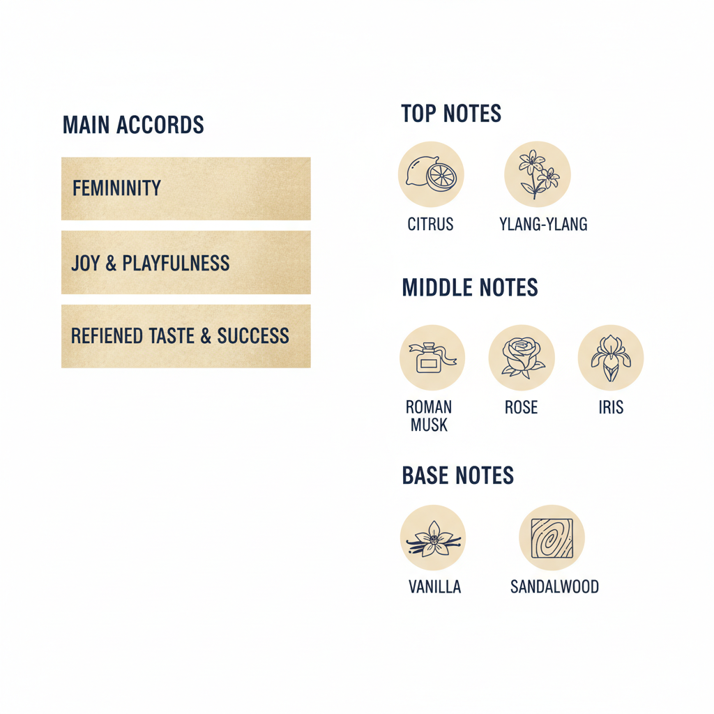 A classic fragrance designed by Jacques Polge that celebrates femininity. It is made for the woman with an attractive personality, offering exceptional joy and playfulness. Perfect for those with refined taste who strive for success. The scent opens with notes of citrus, Roman musk, ylang-ylang, rose, vanilla, iris, and sandalwood.