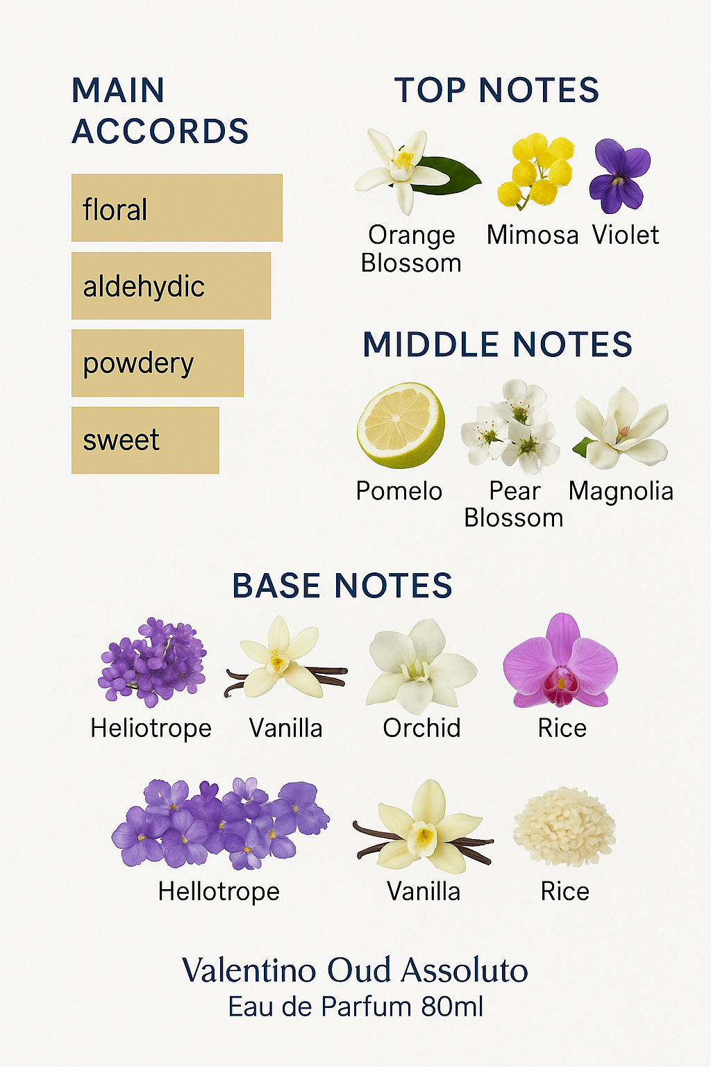 Its main notes exude the scent of heliotrope, vanilla, orchid and rice.