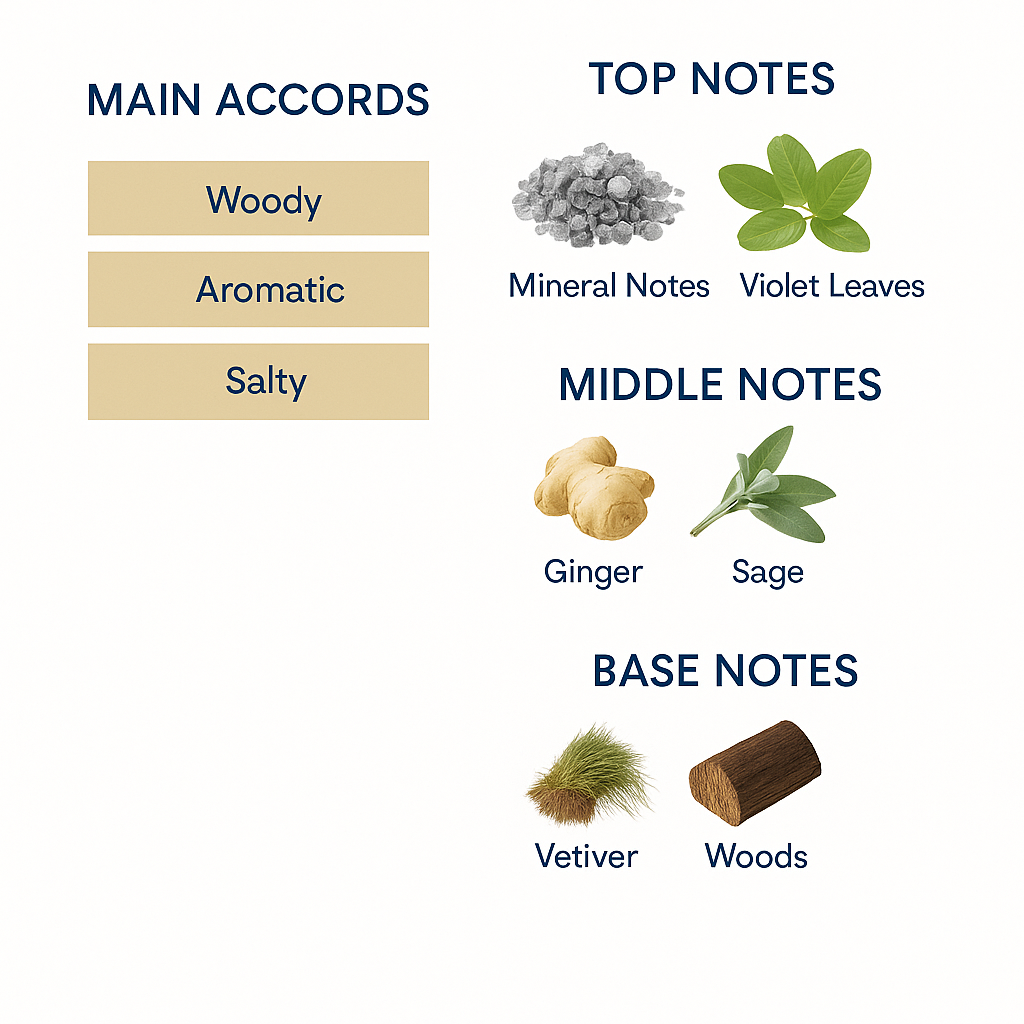 The fragrance opens with an attractive blend of mineral salts and violet leaves.
