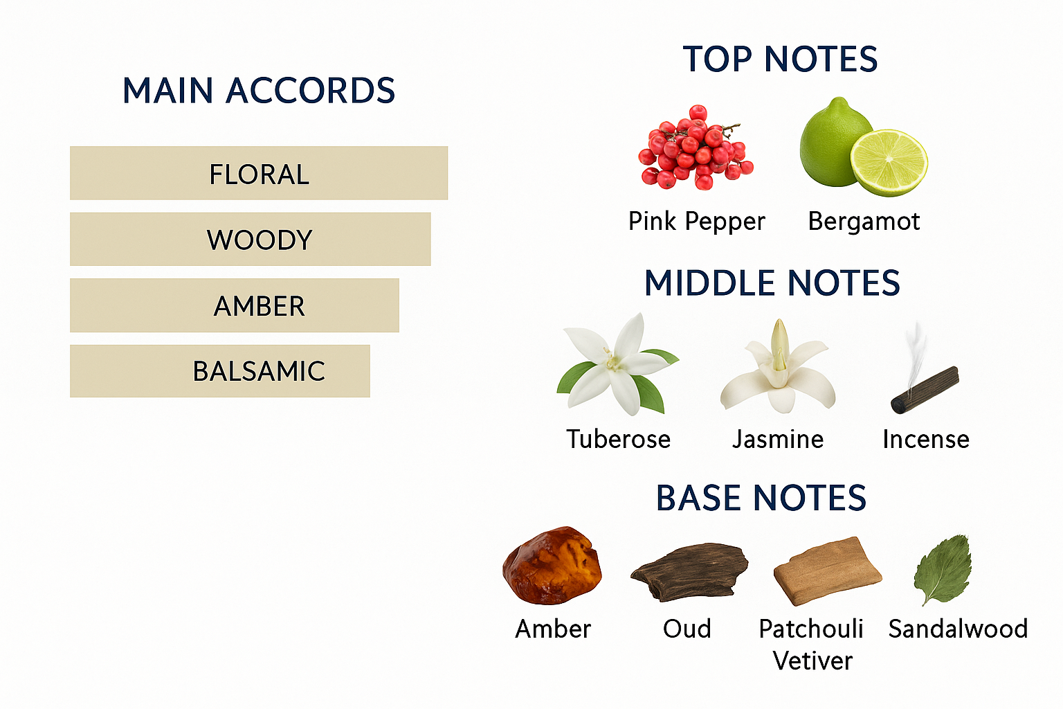While the base concludes with amber, oud, patchouli, sandalwood and vetiver.