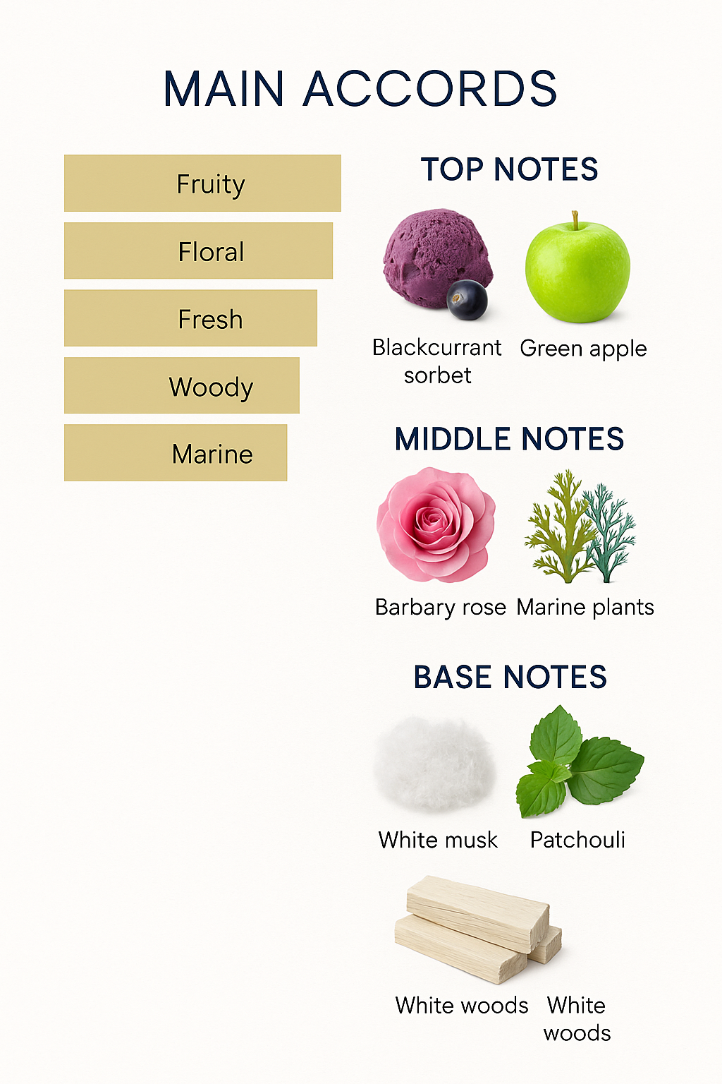 The introduction explodes with refreshing notes of sparkling fruits such as blackcurrant sorbet and green apple, giving you a sense of freshness.