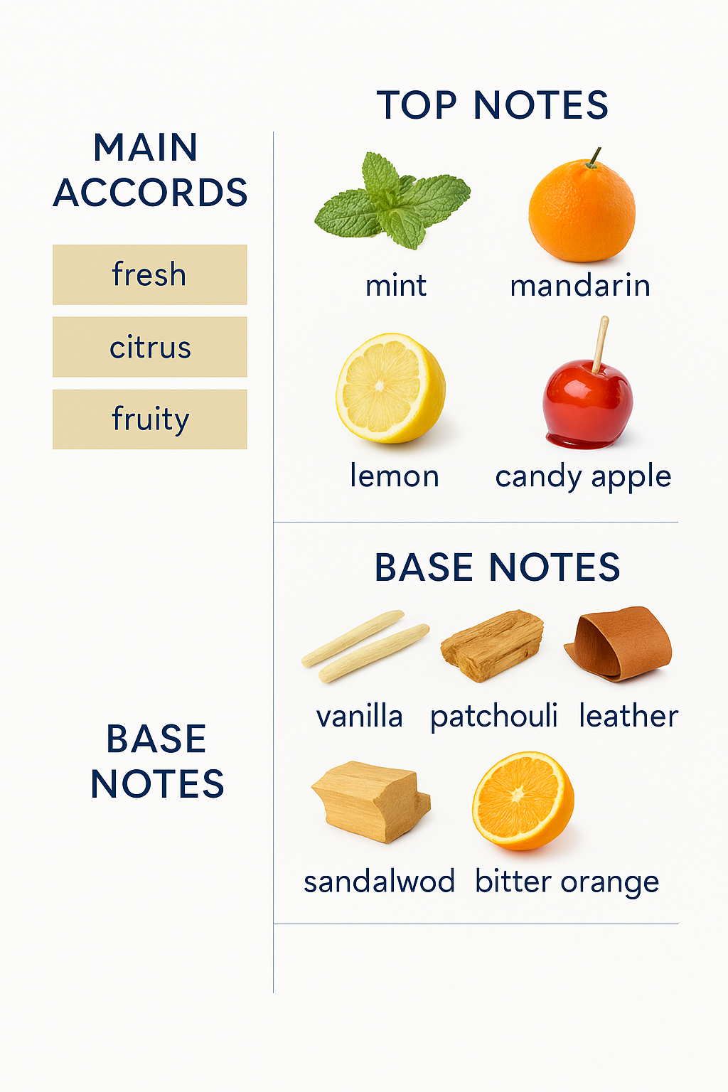 While the base notes conclude the composition with vanilla, patchouli, cedarwood, leather, sandalwood and bitter orange.