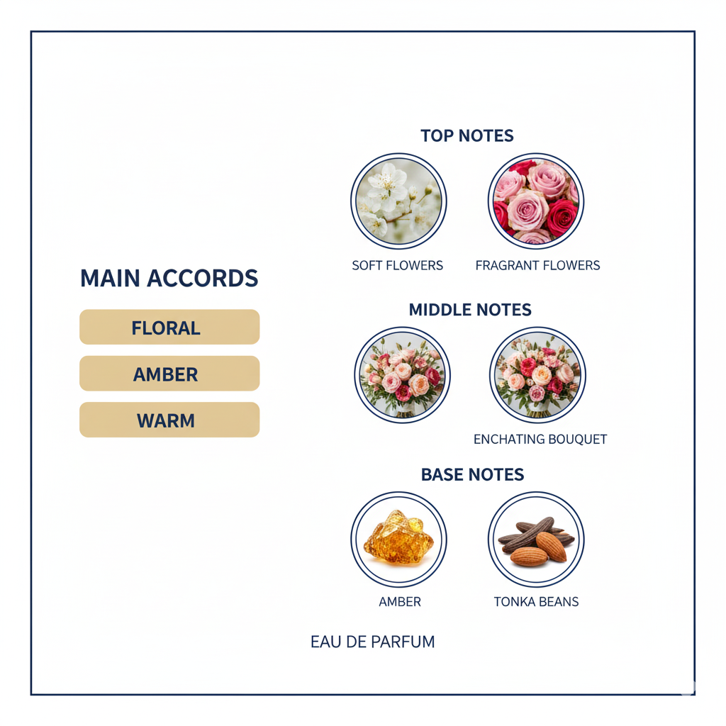 A bouquet of the most beautiful soft and fragrant flowers, blended with a warm base of amber and tonka beans, creates a feminine, enchanting, and refreshing fragrance.