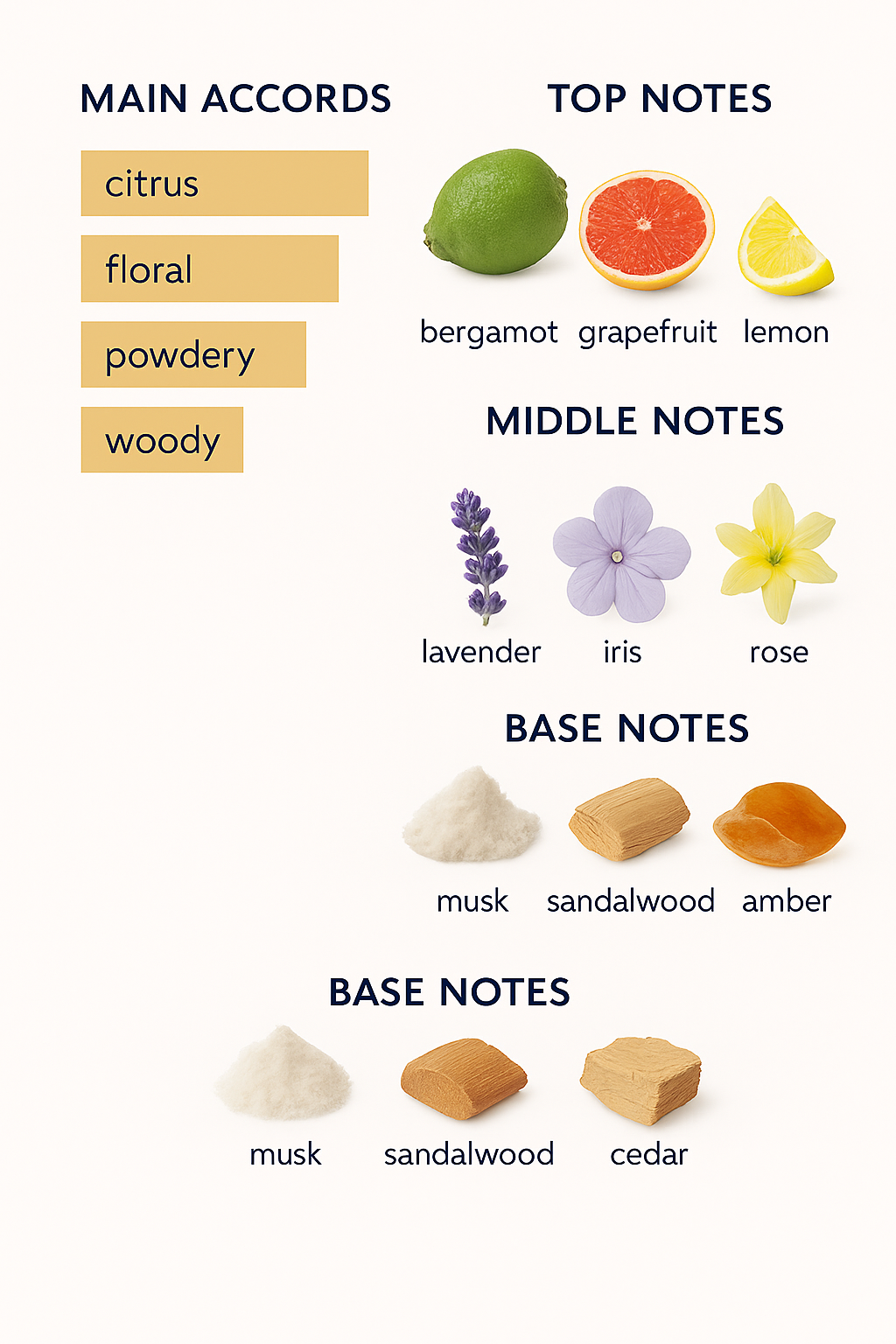 Top notes are bergamot, grapefruit, and lemon. Middle notes are lavender, iris, and rose. Base notes are musk, sandalwood, cedar, and amber.