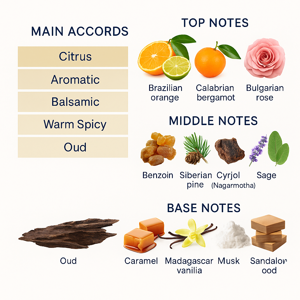Heart notes: Benzoin, Siberian pine, Gurjan balsam, Cypriol (Nagarmotha), Lavender, Sage.