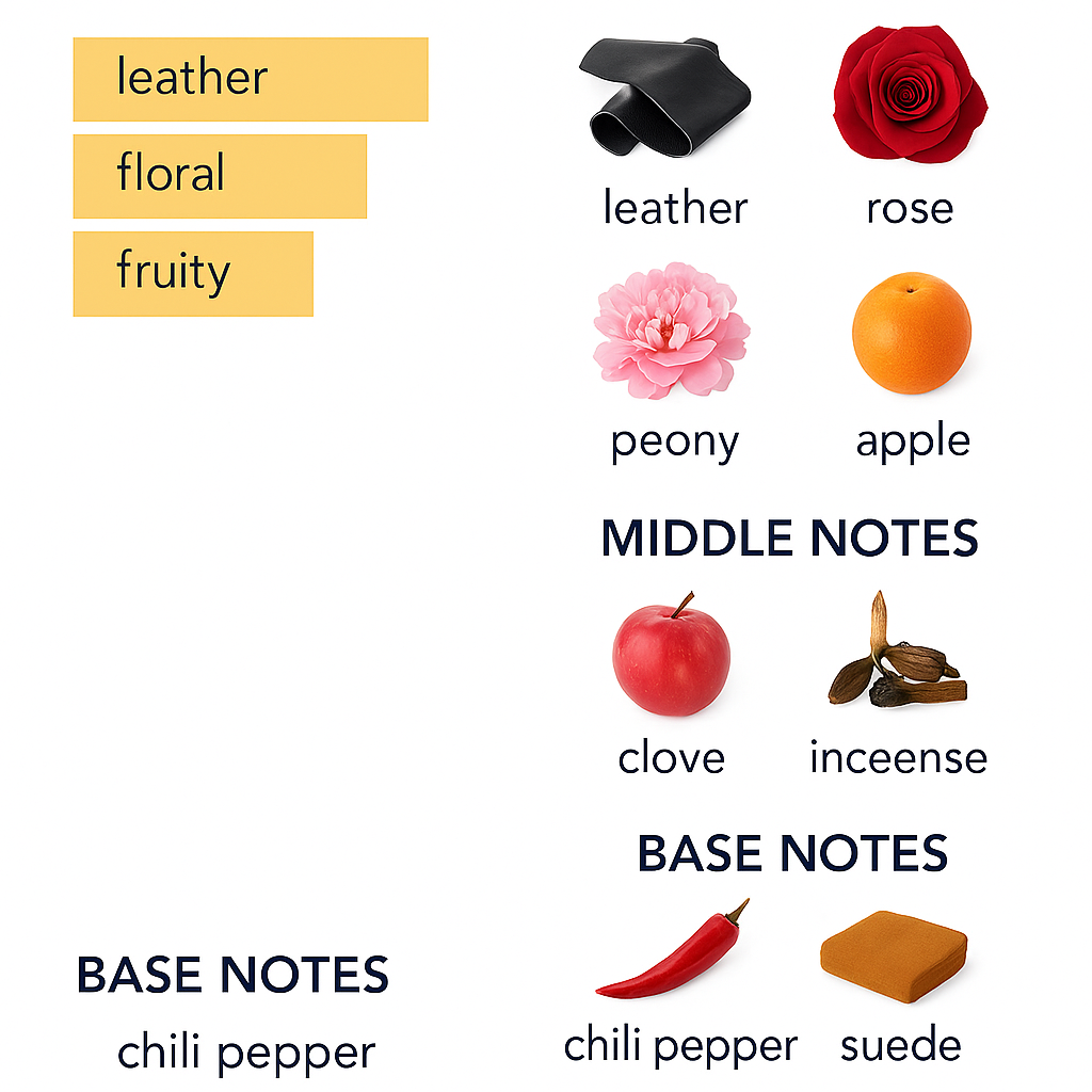 Sharp leather scents harmonize with floral fragrance and delicious fruity taste in clear contrast to reveal to the world the secret of your attractive and exciting beauty.