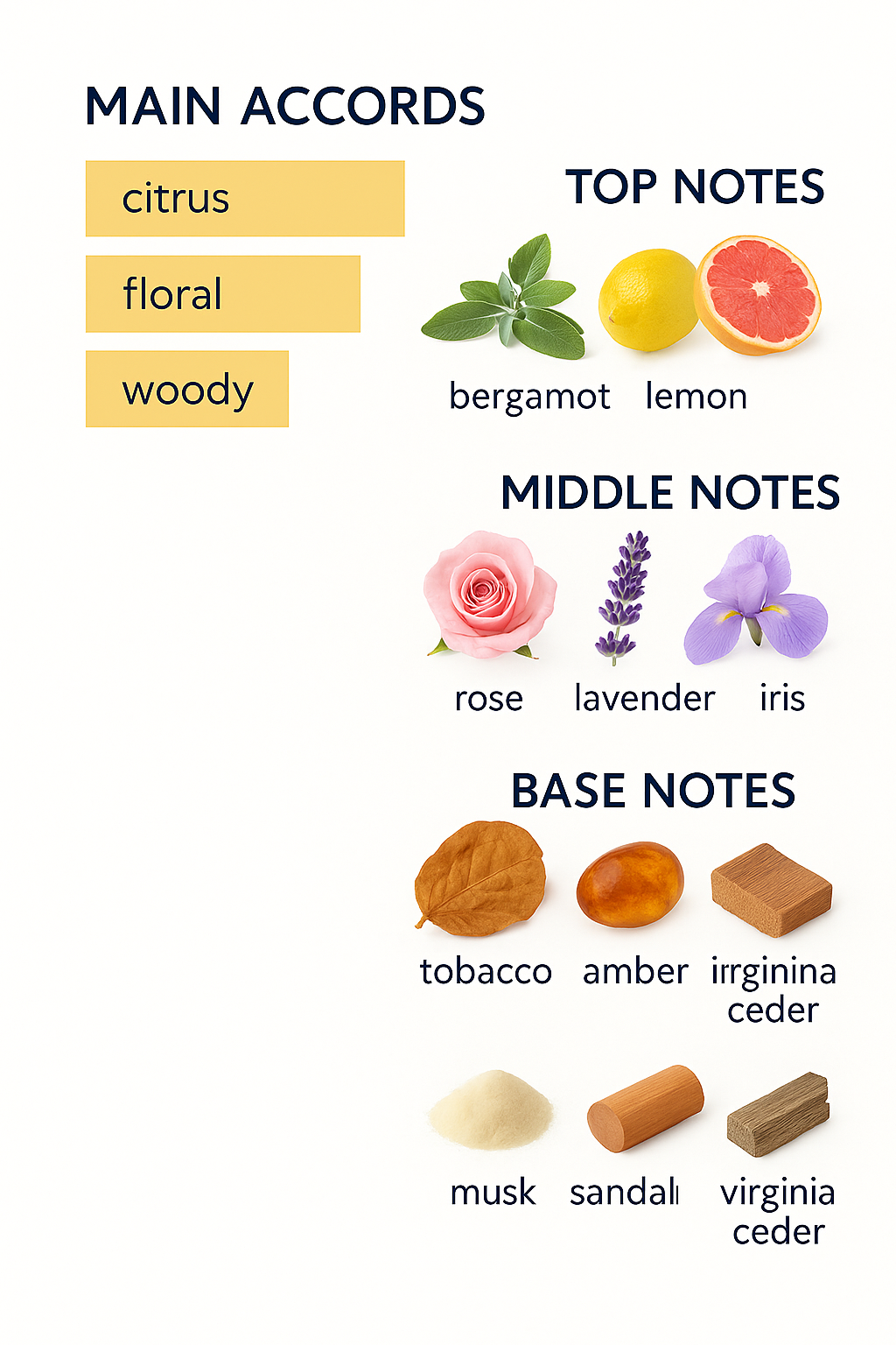 The base notes are musk, amber, sandalwood and Virginia cedar