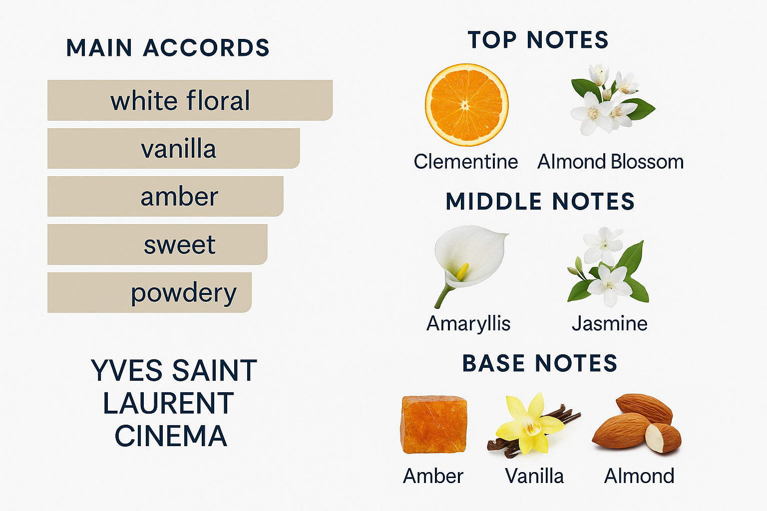 Yves Saint Laurent Cinema is an oriental floral fragrance designed especially for you to live the spotlight and shine like a star. It features a unique and distinctive blend of notes that captures all the attention!