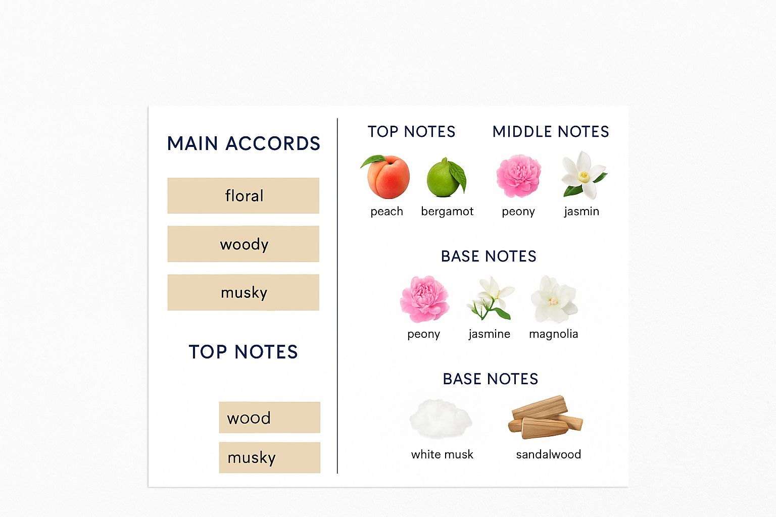 The scent settles into a warm, smooth base of white musk and sandalwood, leaving a clean, sensual trail.
