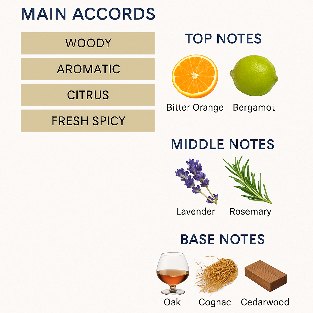 Base Notes: Oak, cognac, vetiver, and cedarwood