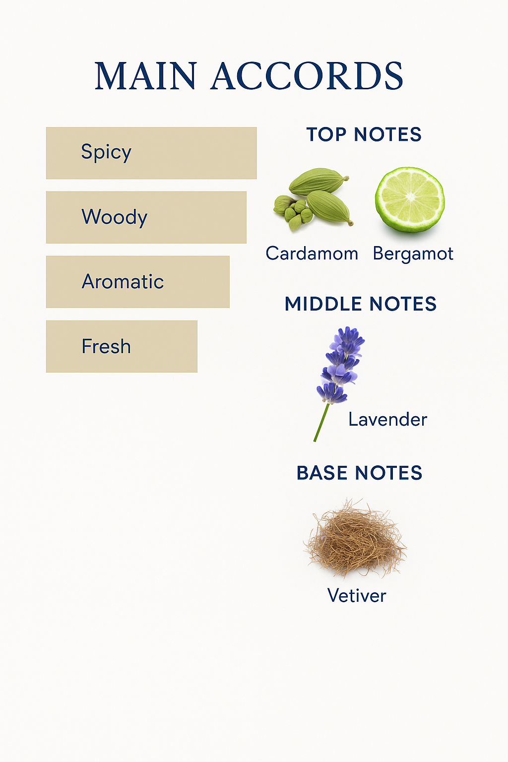 Shine with an elegant look and turn all eyes on you with this enchanting perfume. It gives you a warm cardamom scent mixed with cozy woody notes, plus a fresh touch of lavender and bergamot blended with vetiver, creating a unique and irresistible fragrance.