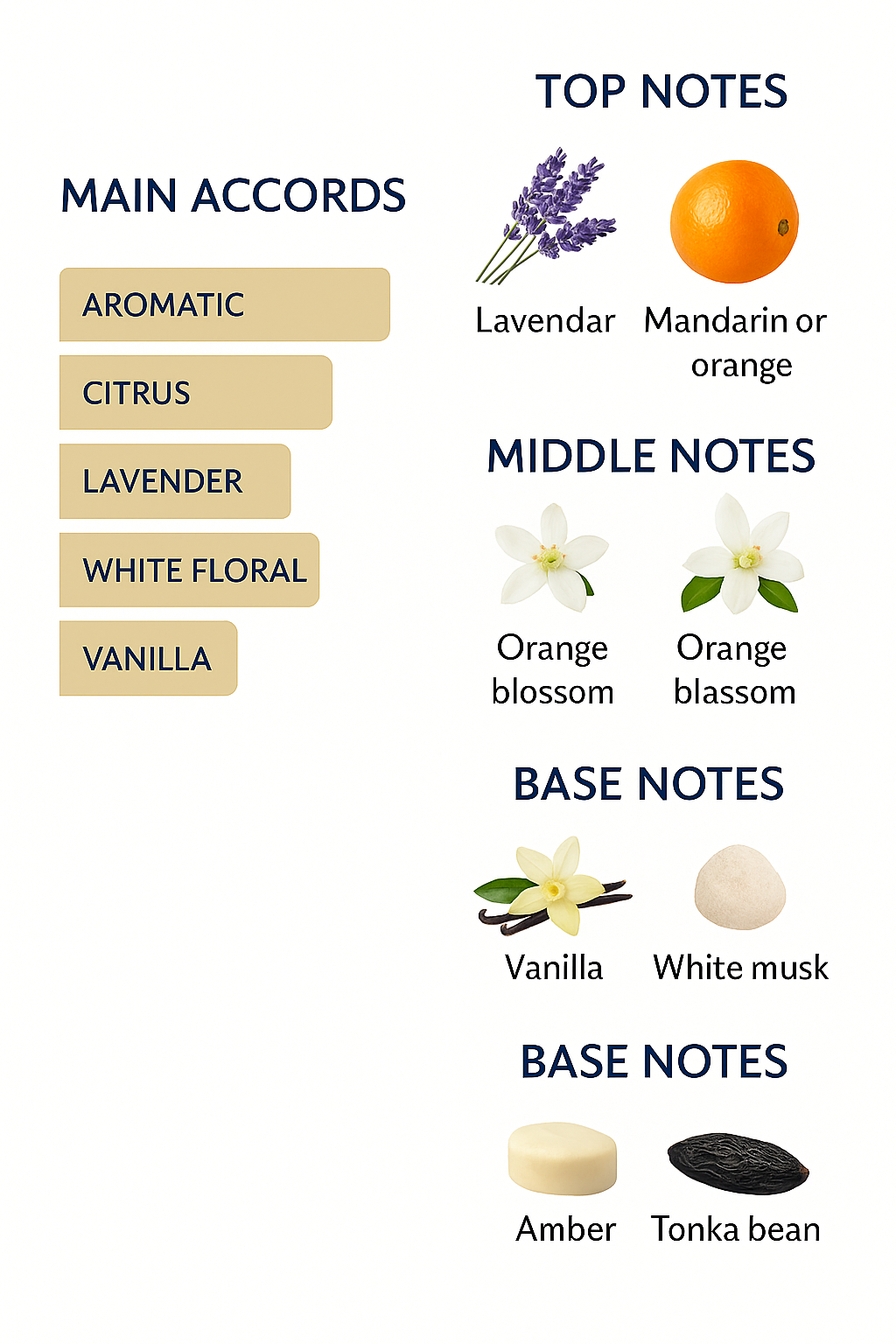 Top notes are lavender, mandarin orange and neroli; middle notes are orange blossom and jasmine; base notes are vanilla, white musk and tonka bean.