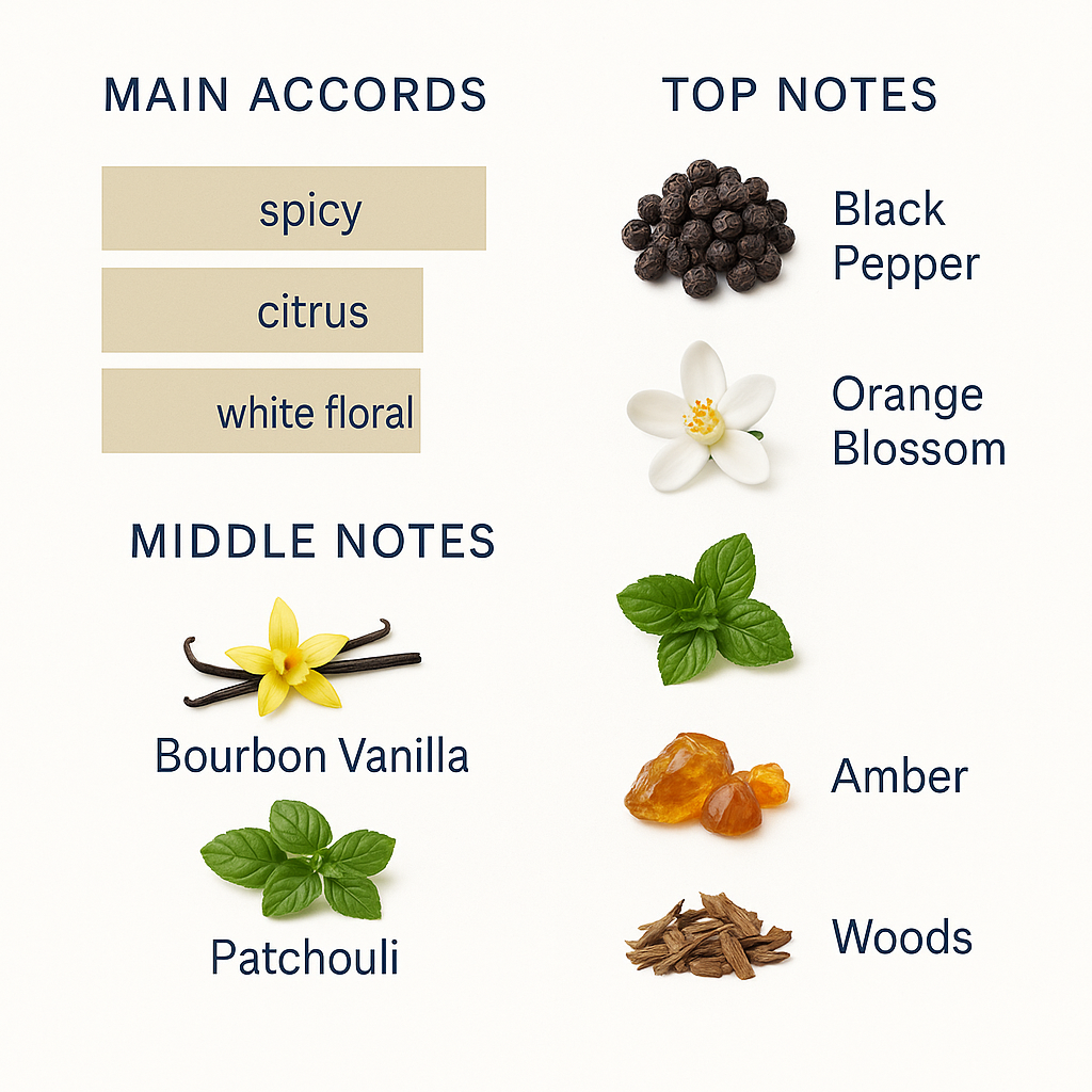 Base Notes: Bourbon Vanilla, Patchouli, Amber, and Woods