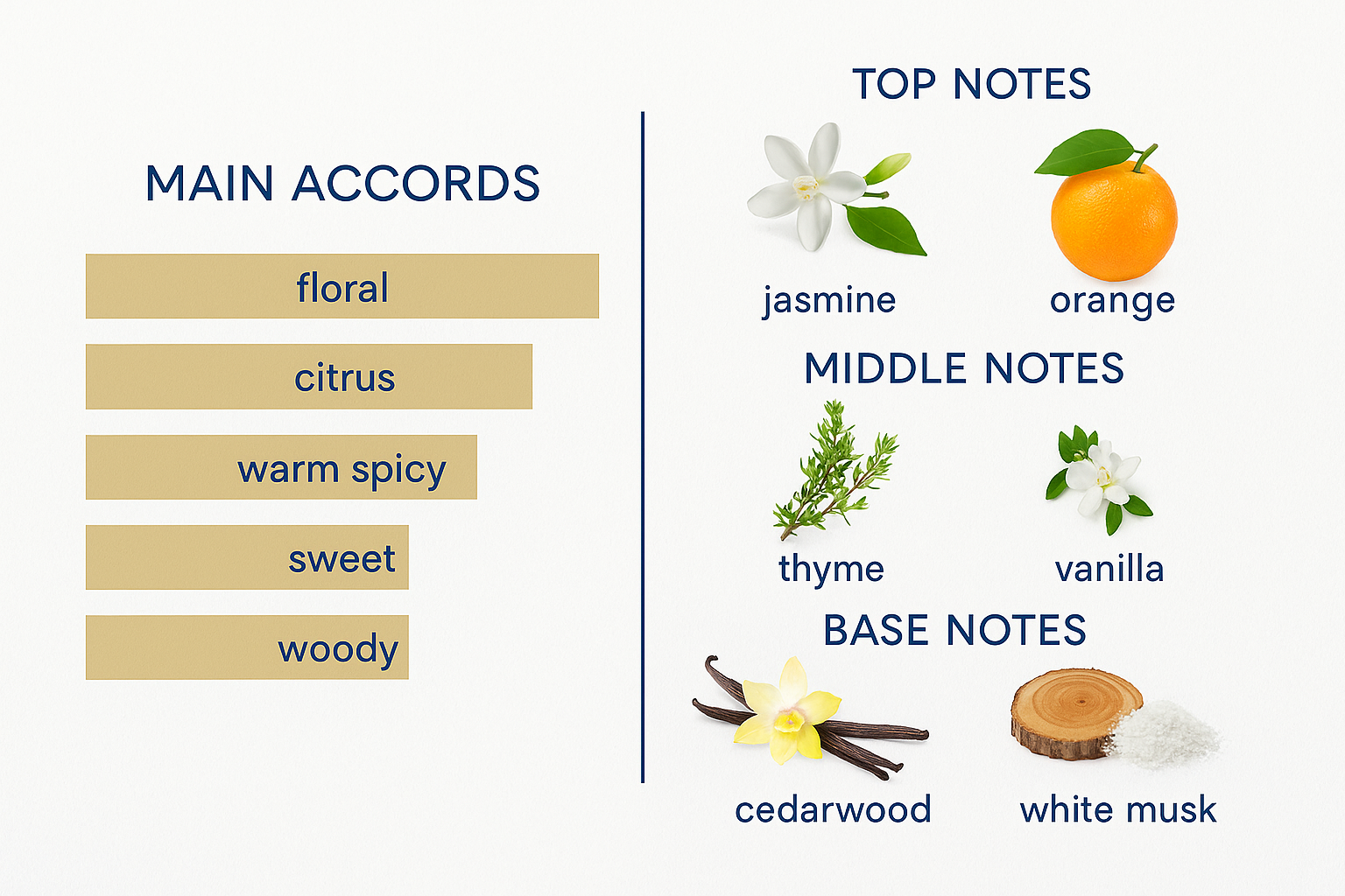 Balanced and harmonious: Mixes oriental, woody, and sweet notes to give a feeling of beauty and freshness.