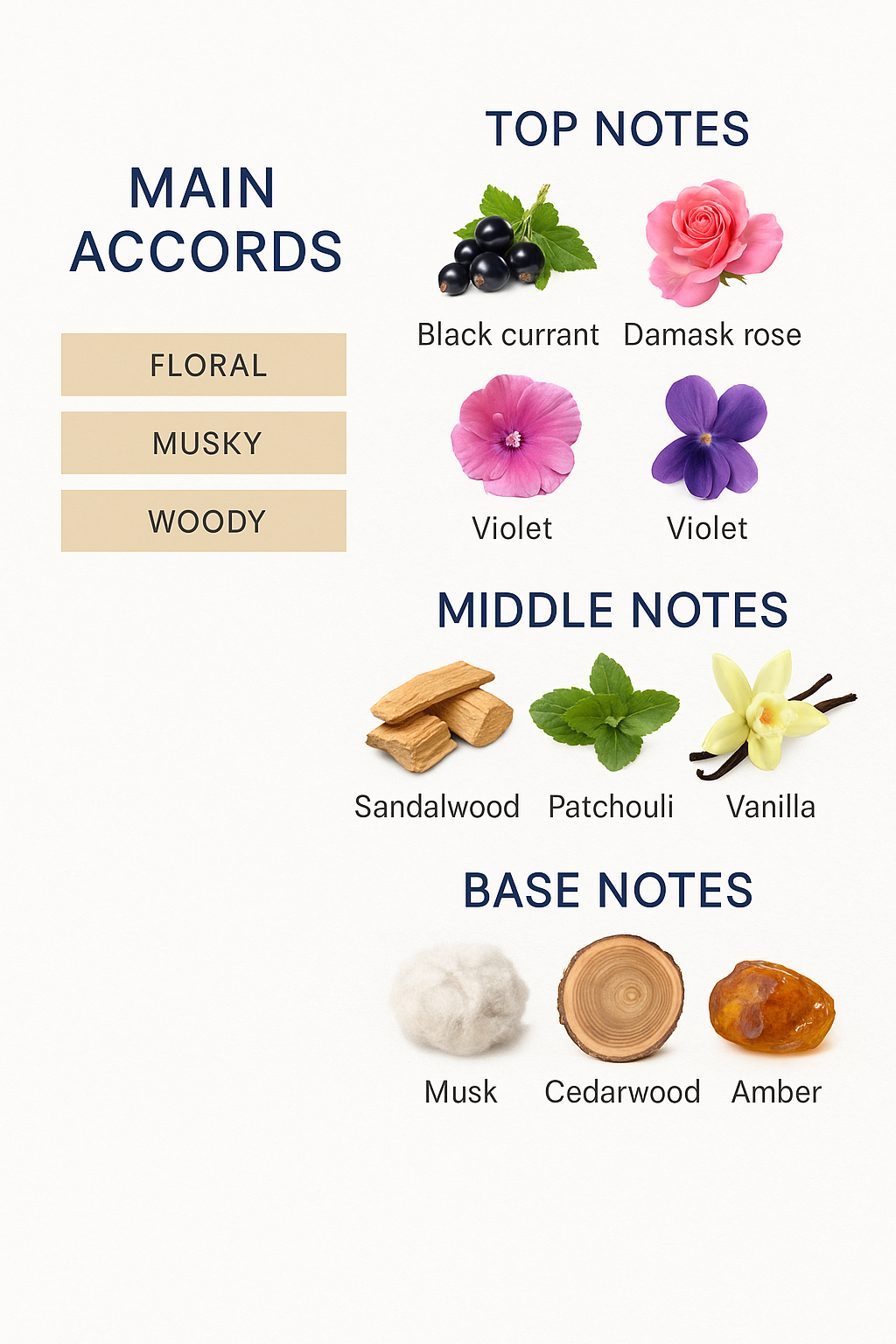 Top notes: Black currant, Damask rose, and violet, giving a fresh and lively scent.