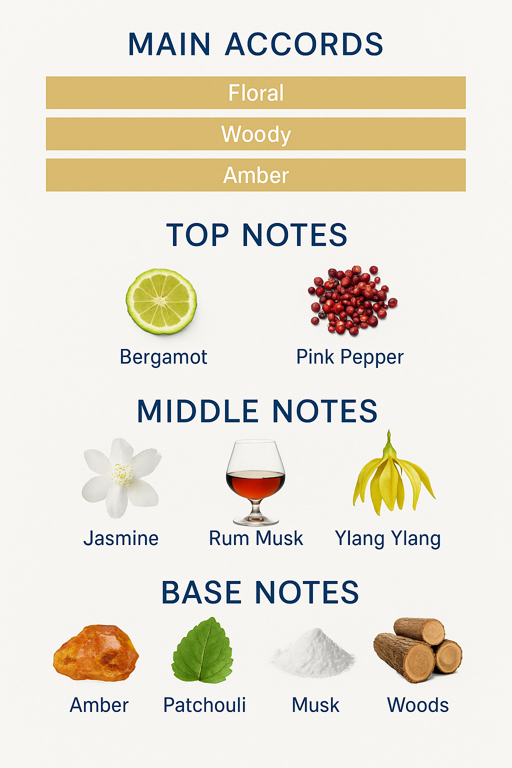 Heart notes: Jasmine, Rum Musk, Ylang Ylang